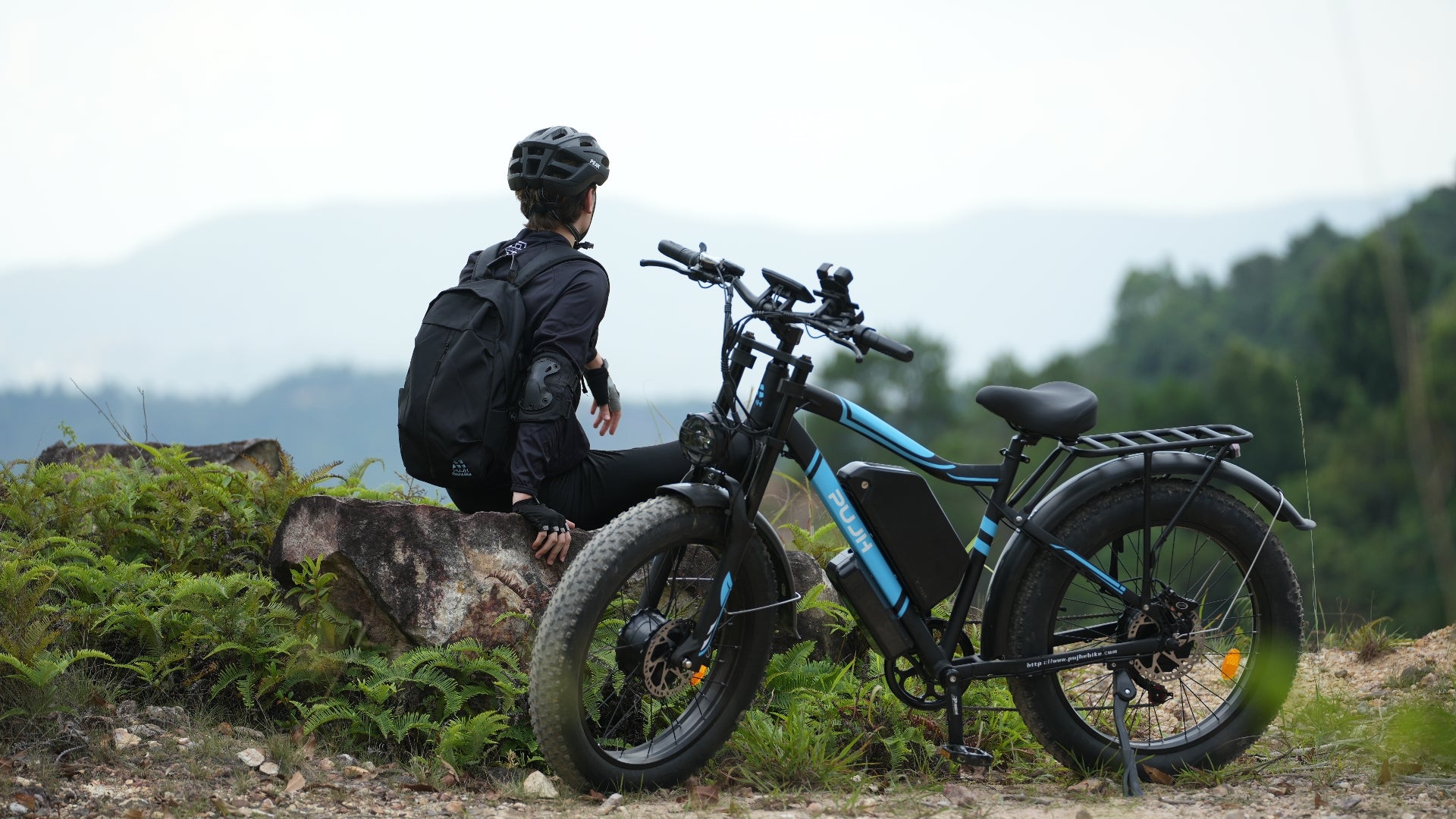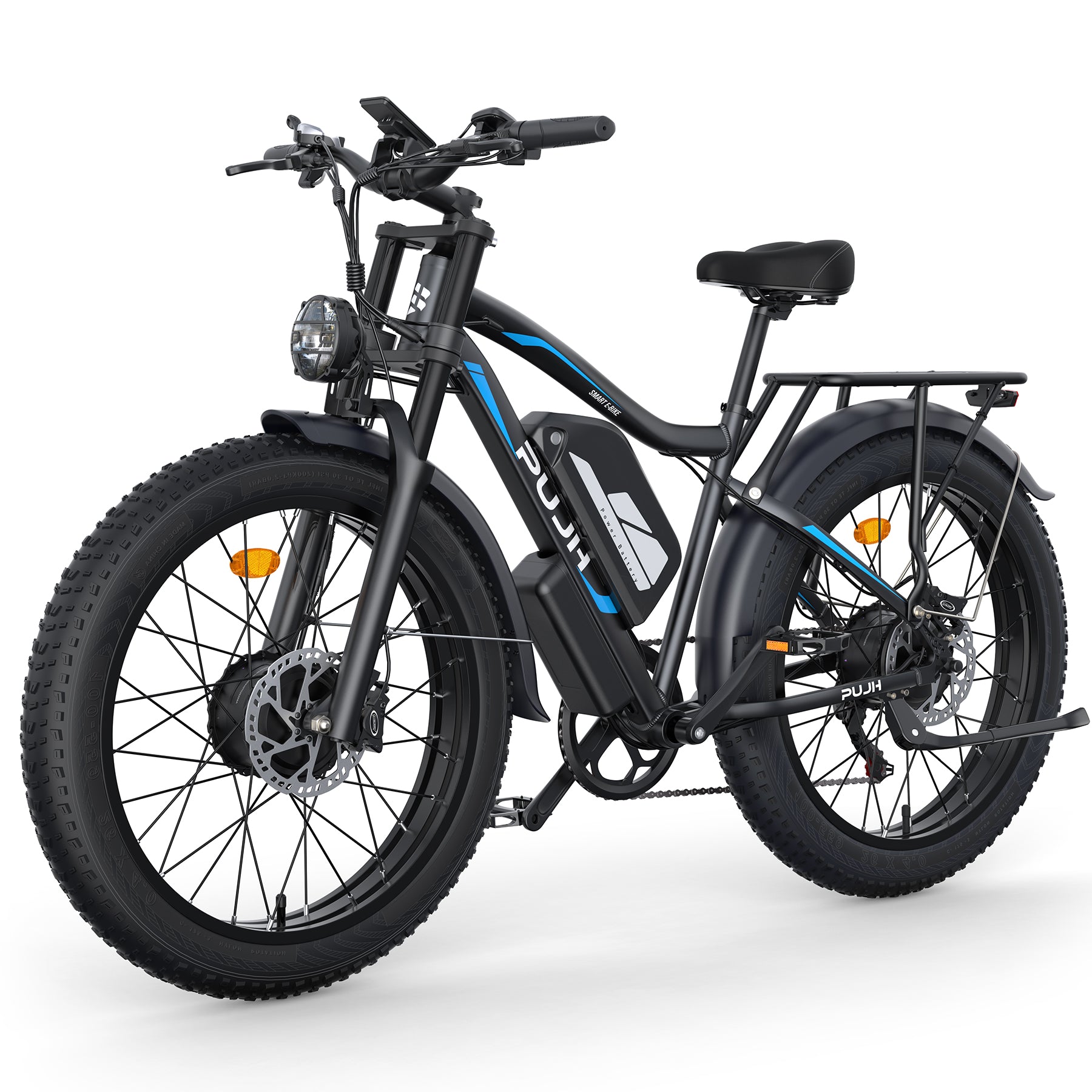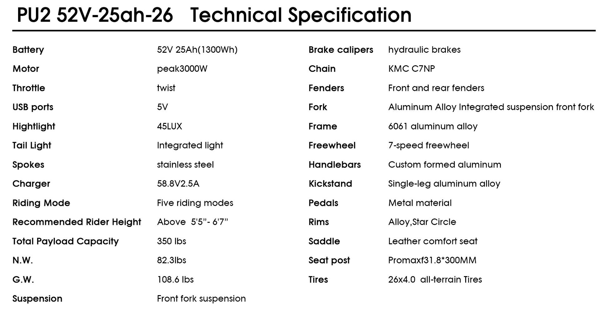 PUJH PU2-52V25AH- Full Suspension Fat Tire E-bike, 55 mph top speed, 100 mile range, 3000 Wh, 38 kg, 26 in - Black.